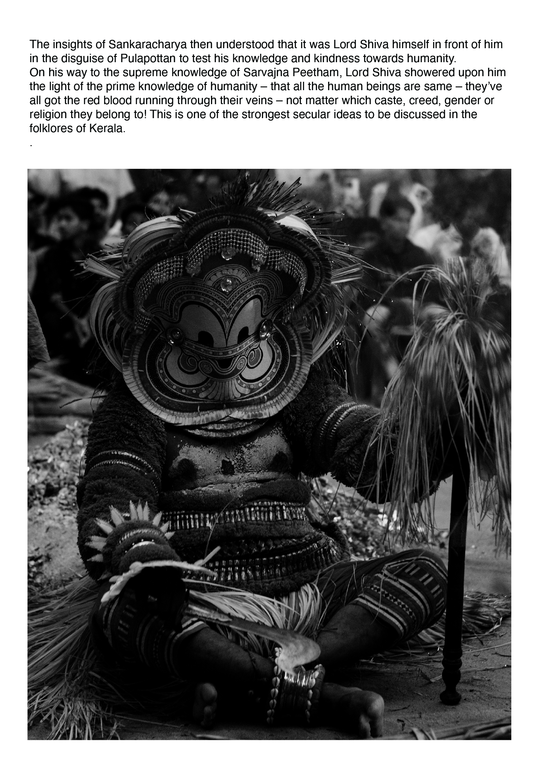 The project documents the visual culture of Theyyam, a ritualistic religious art form practiced in northern Kerala. It specifically focuses on Pottan Theyyam, a powerful form believed to confront and question social evils, using performance, costume, and symbolism as tools of resistance and social commentary.