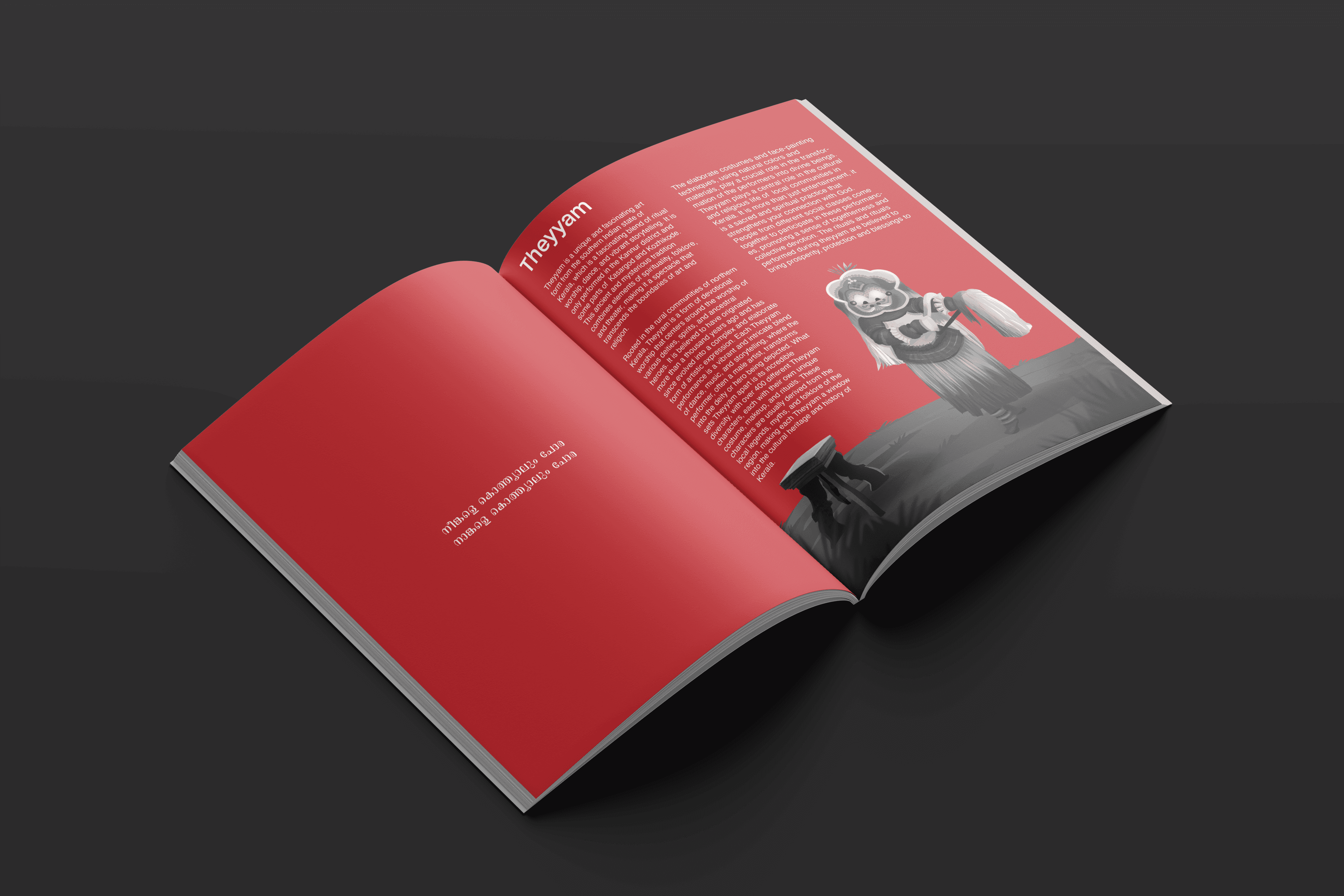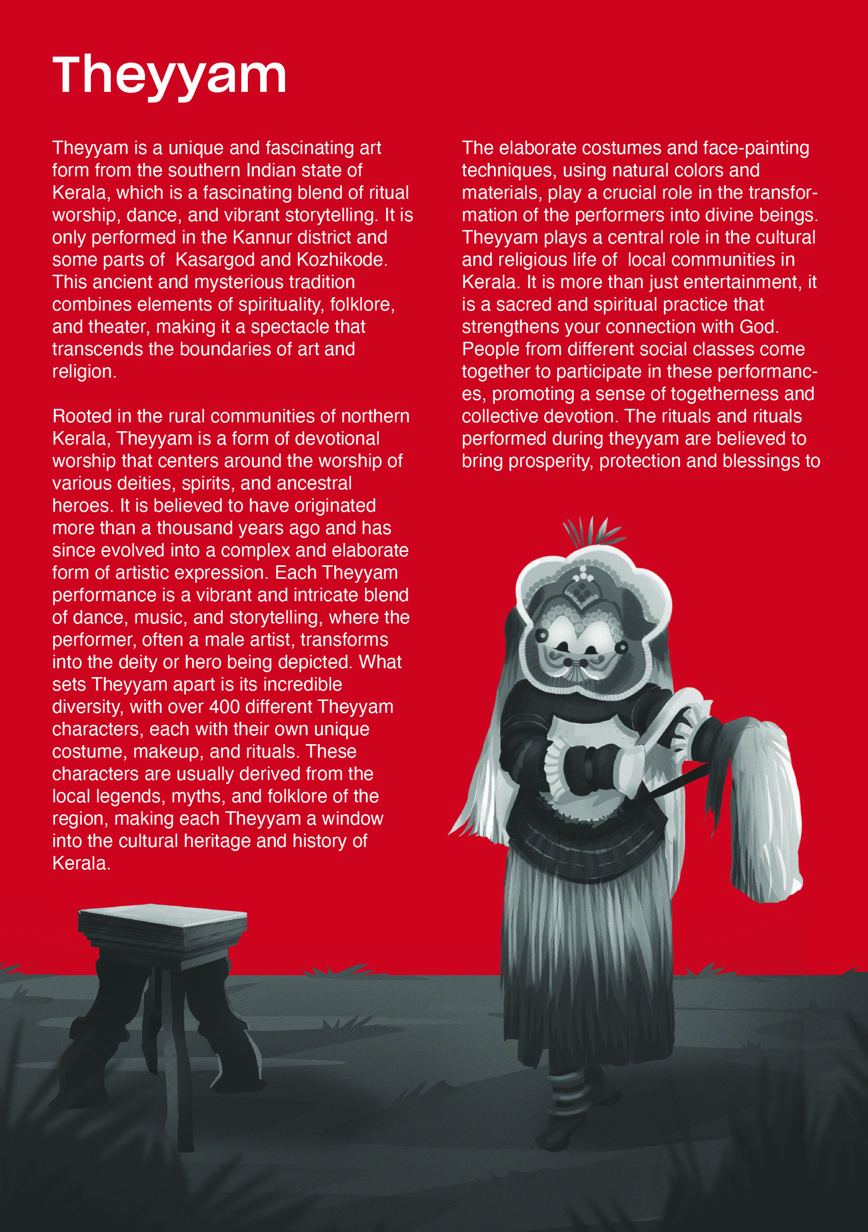 The booklet explores Theyyam and Pottan Theyyam in detail, covering the entire performance ecosystem—its preparation, ritual processes, makeup, religious practices, and the families traditionally associated with the art form. It also features an in-depth interview with a Pottan Theyyam artist, offering insights into their lived experiences and identity as a performer, along with conversations with associated families to understand the cultural lineage and collective way of life surrounding the practice.